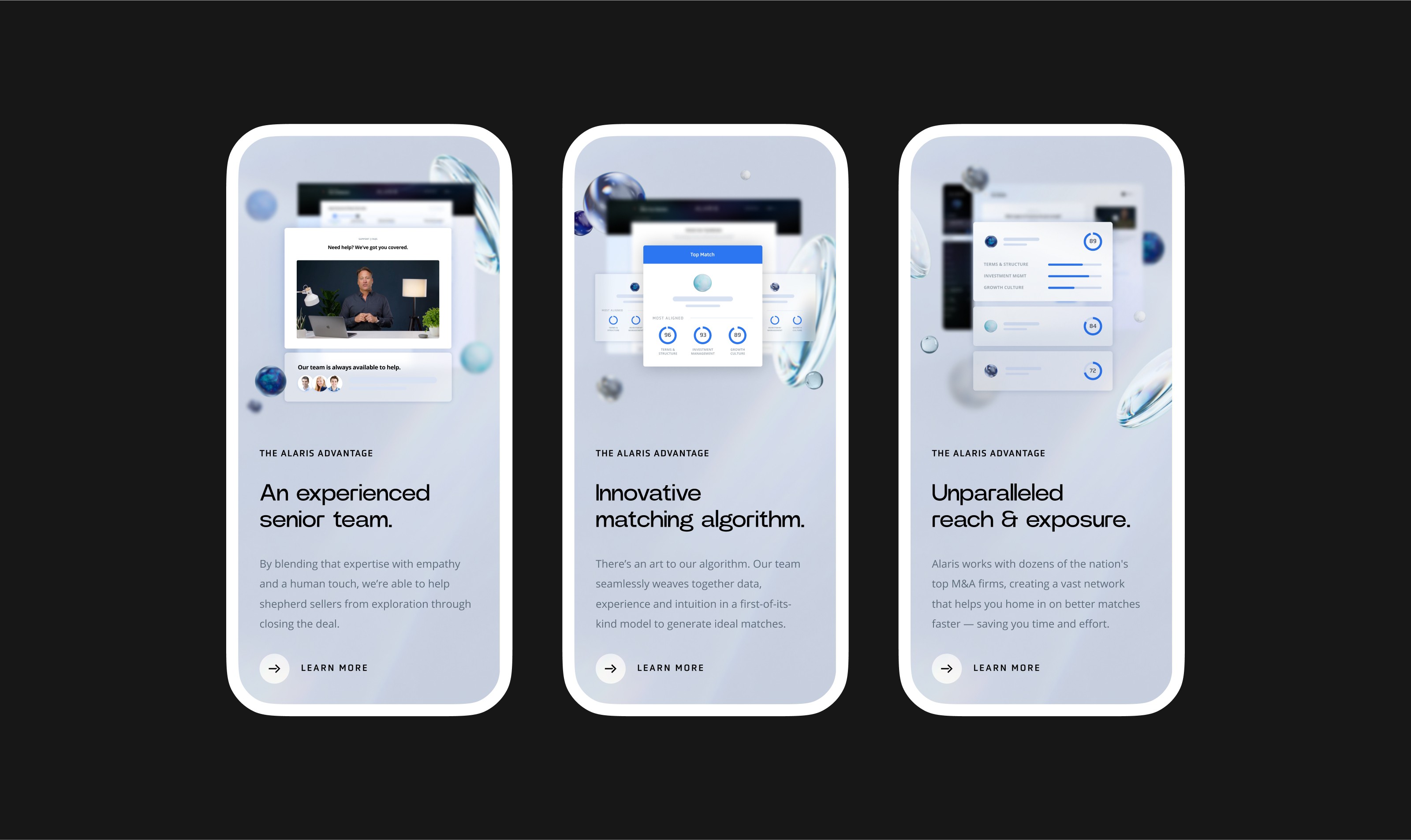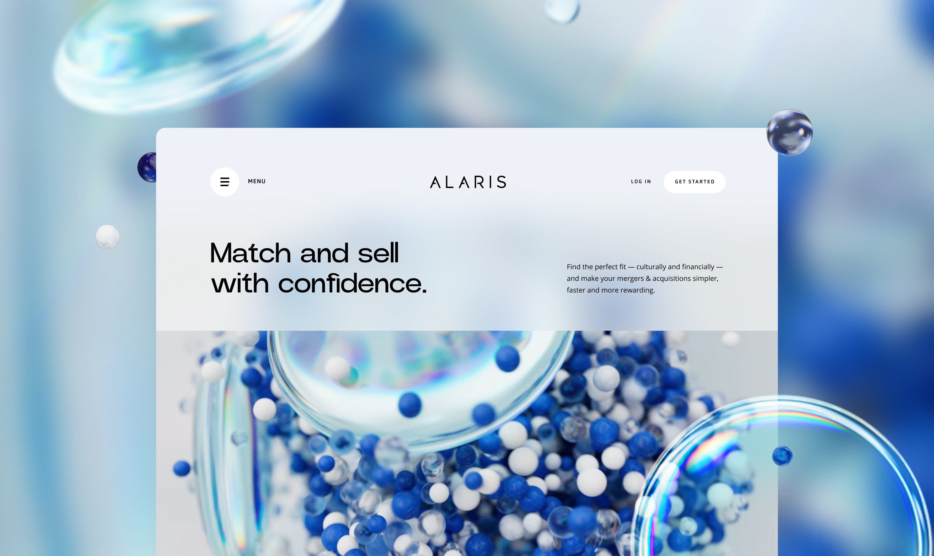 Alaris reshapes M&A with an advanced matching algorithm. We crafted an innovative website, seamlessly integrating it with the brand's new identity centered around the transformative power of the Lens.
